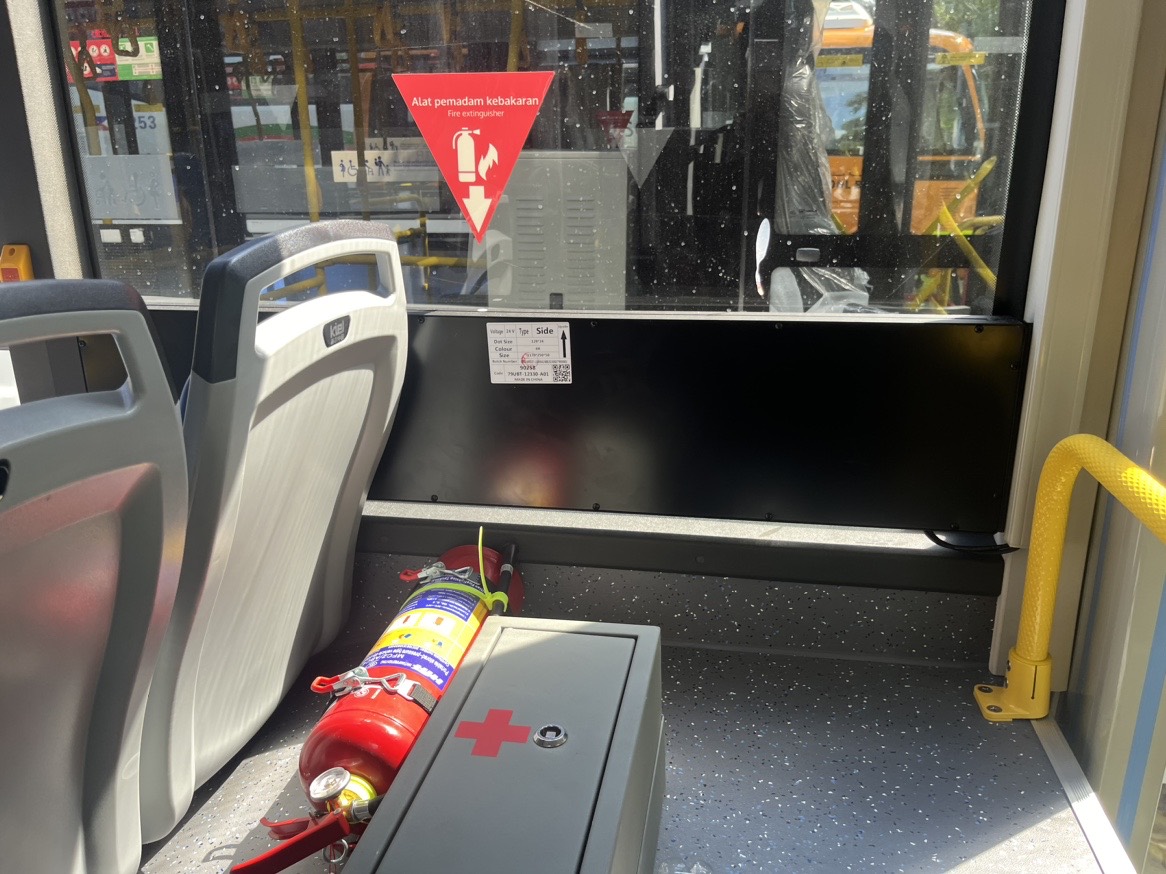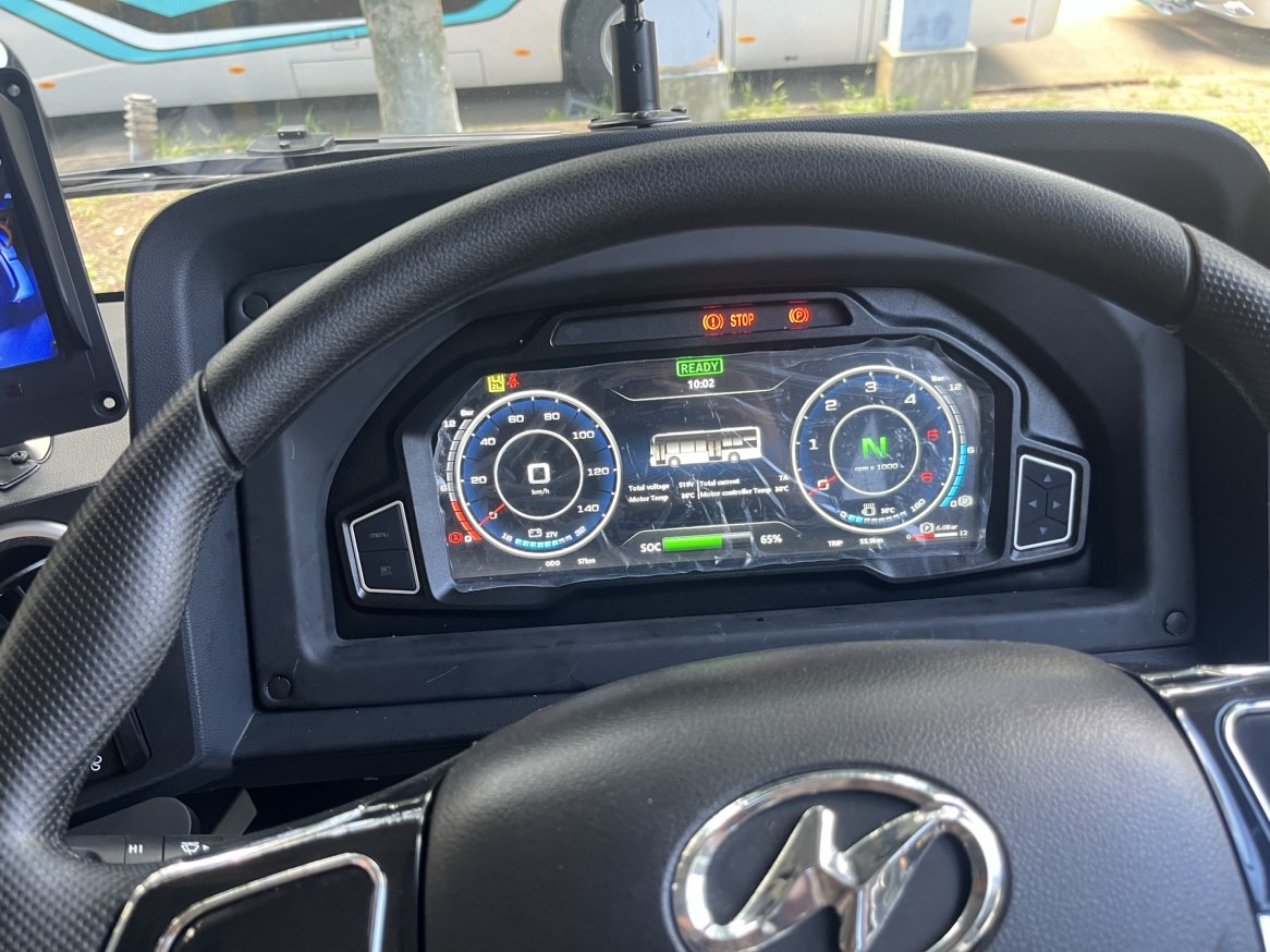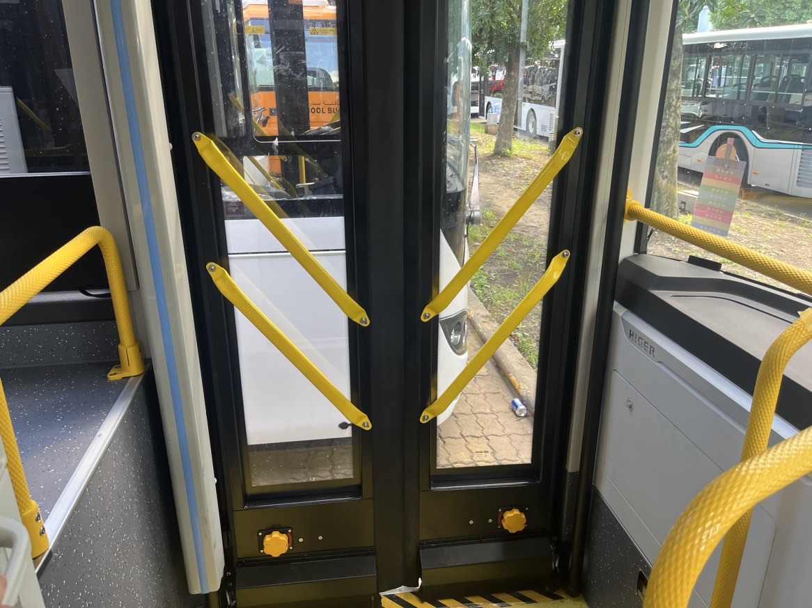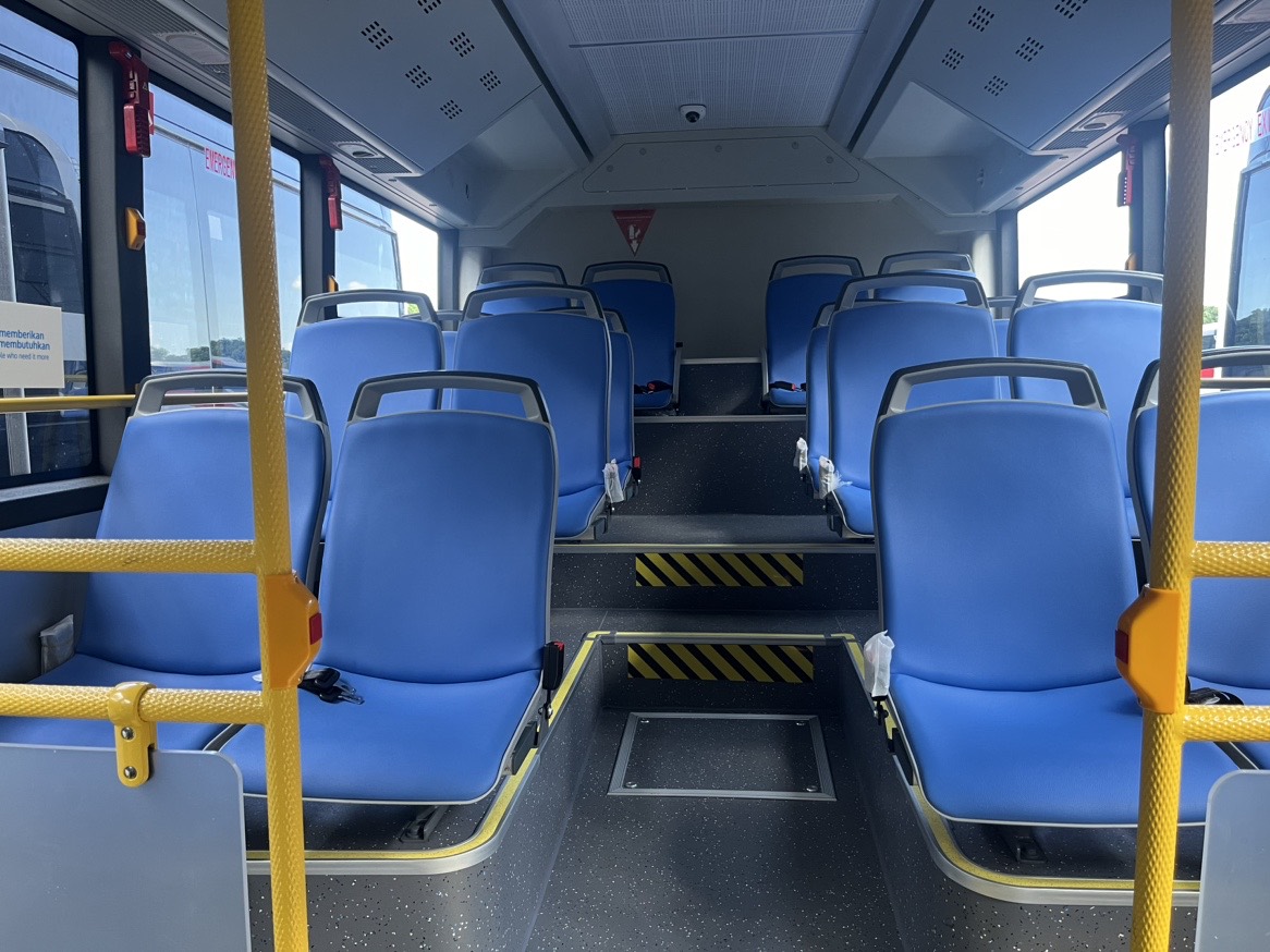 10.5米低入口纯电公交,搭载303度电池和德纳电机,中间双门对开门,配置格拉摩座椅及豪华内饰。